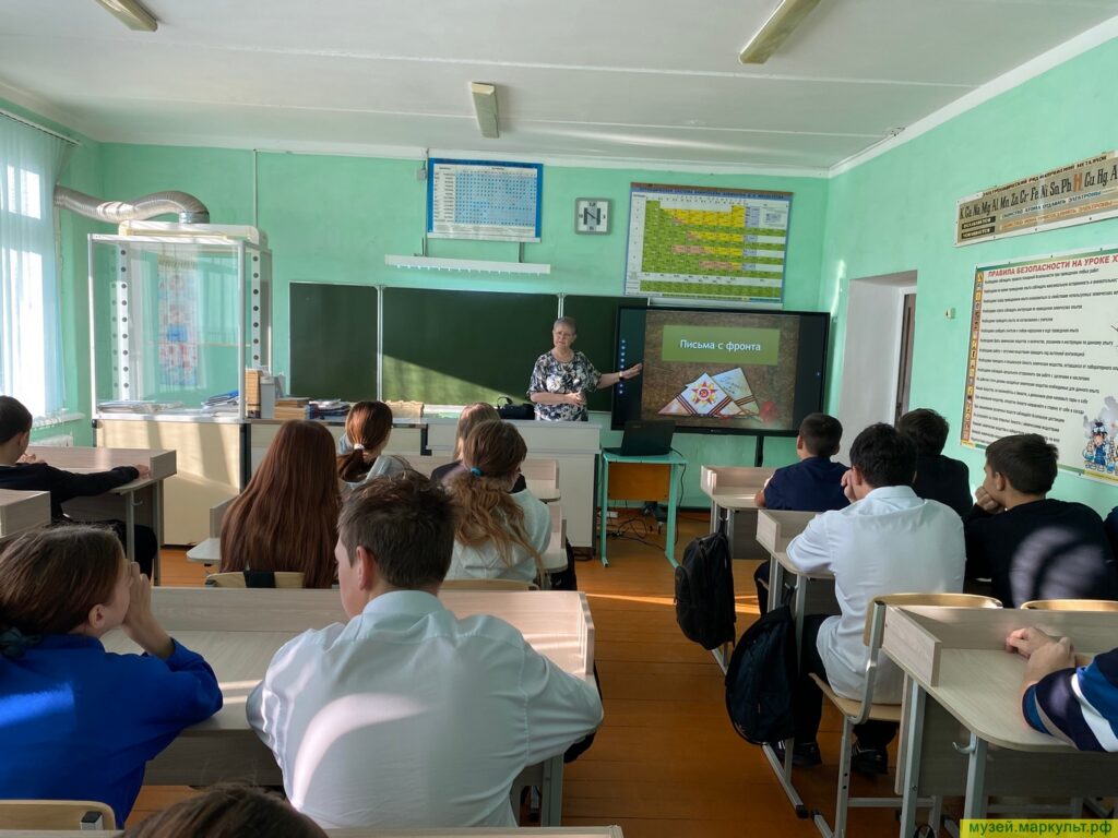 А для 8–9 классов Татьяна Владимировна Эйзен провела лекцию-презентацию «Я пишу последнее, быть может…», где прозвучали фронтовые письма из фондов музея, показаны архивные документы и фотографии военной поры. Звучала и музыка, и стихи.