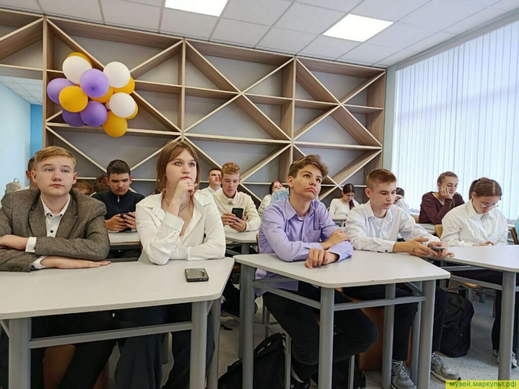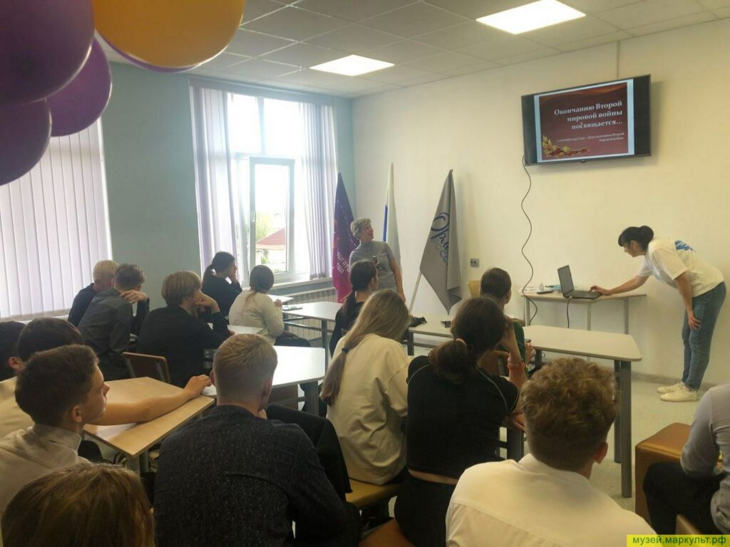 Экскурсовод Краеведческого музея Ирина Сангатовна Горбатых совместно с Волонтёрами Победы «Юное поколение» и Навигаторами детства провели для девятиклассников Марьяновской СОШ №1 урок, посвященный окончанию Второй мировой войны.
